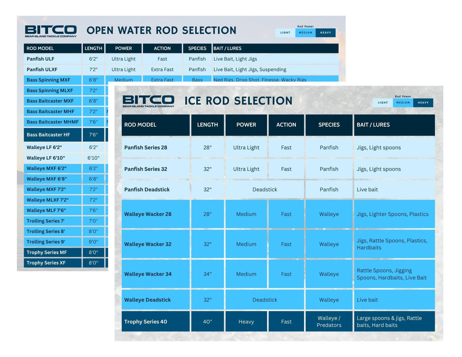 Not sure what rod to choose? Let us help you make your decision with our simple charts that will guide you based on your desired species and tactics.